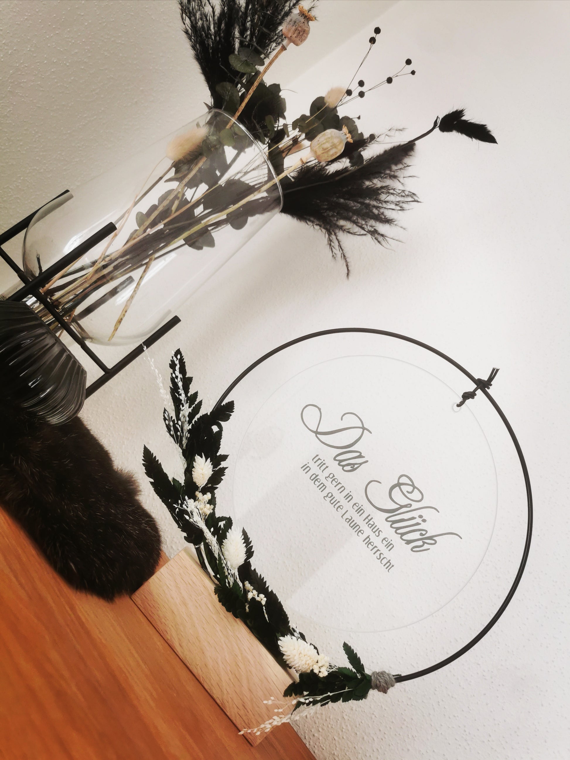Liebevoll gestaltete Glasscheibe passend für verschiedene Dekozwecke, alleinhängend oder auch zusammen in einem Metallring mit Trockenblumen ein Blickfang.