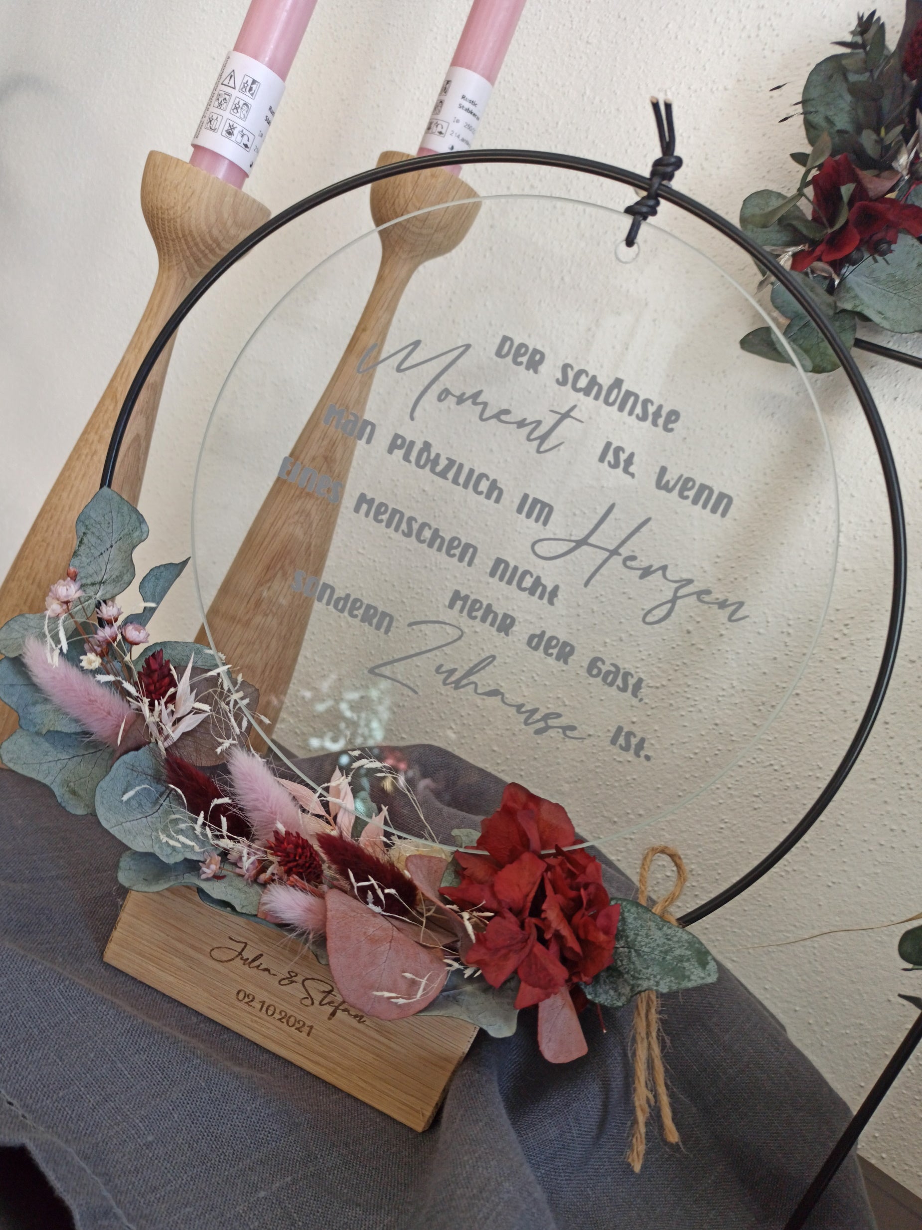Liebevoll gestaltete Glasscheibe passend für verschiedene Dekozwecke, alleinhängend oder auch zusammen in einem Metallring mit Trockenblumen ein Blickfang.