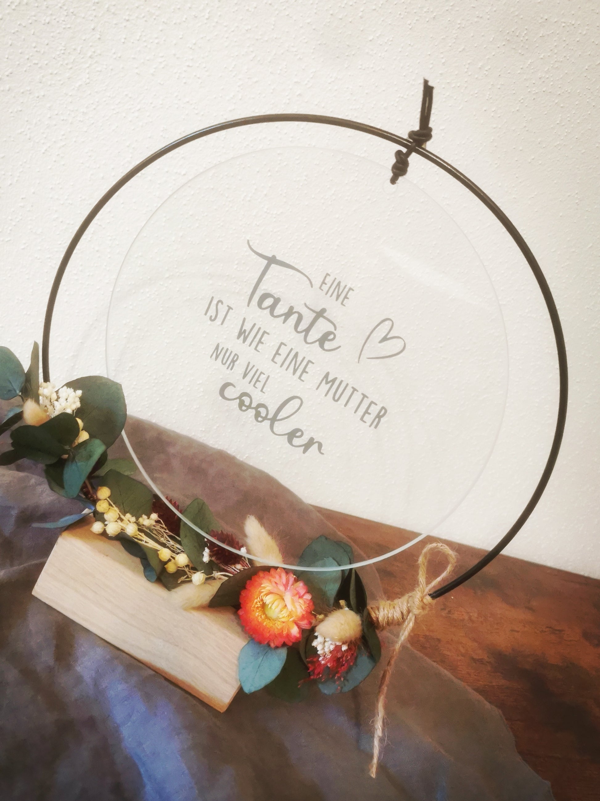 Liebevoll gestaltete Glasscheibe passend für verschiedene Dekozwecke, alleinhängend oder auch zusammen in einem Metallring mit Trockenblumen ein Blickfang.