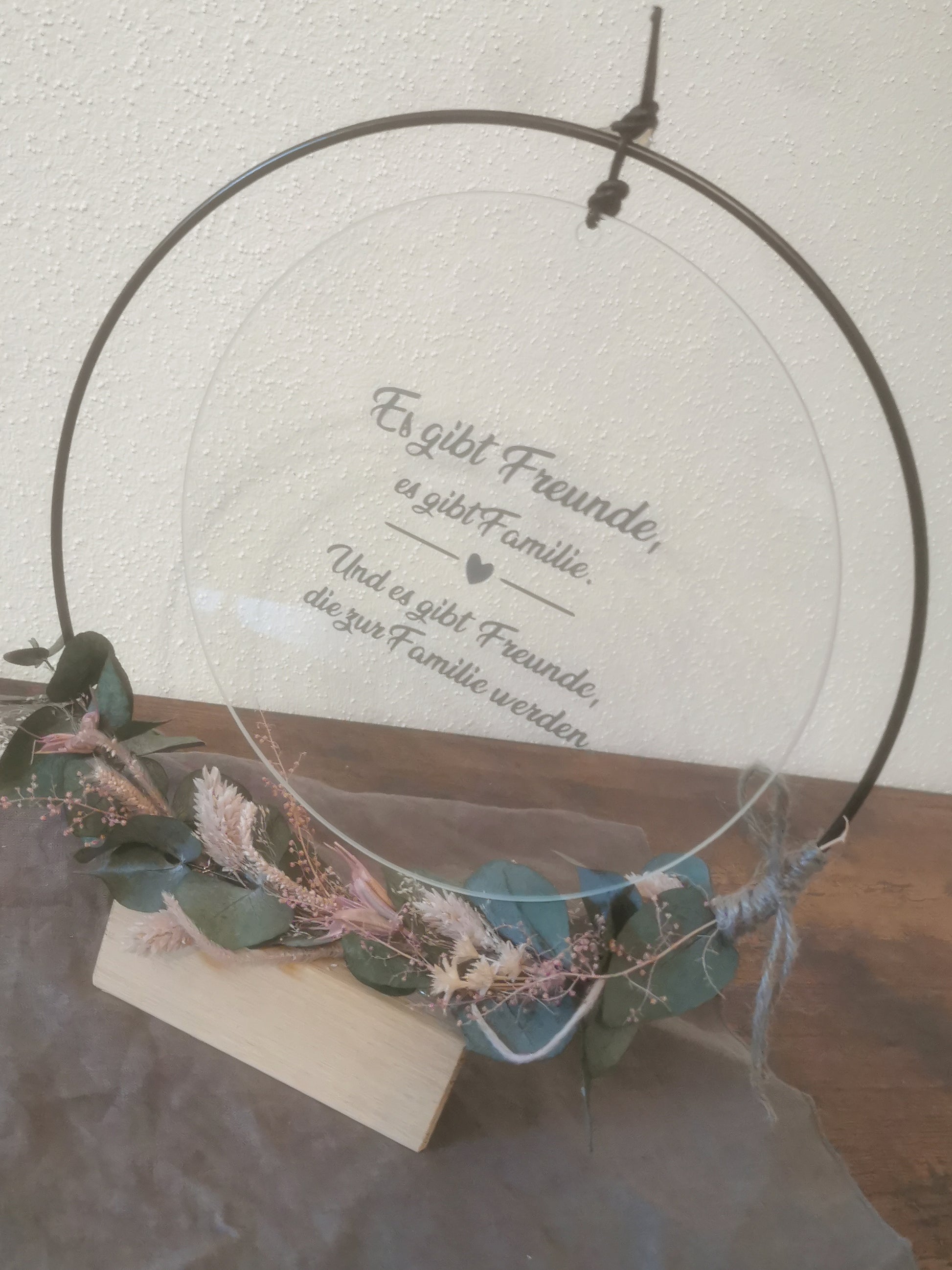 Liebevoll gestaltete Glasscheibe passend für verschiedene Dekozwecke, alleinhängend oder auch zusammen in einem Metallring mit Trockenblumen ein Blickfang.
