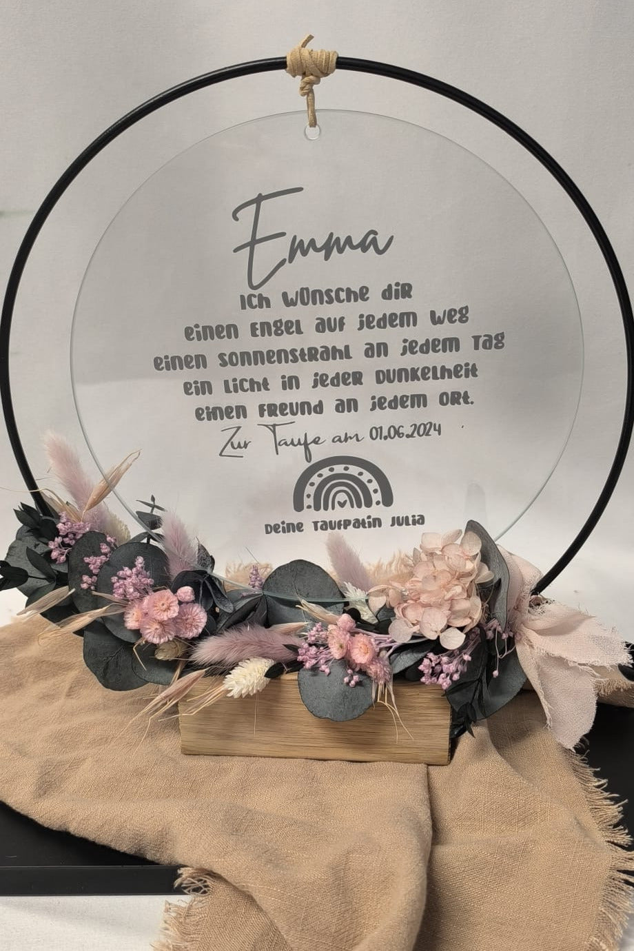 Liebevoll, individuell gestaltete Glasscheibe als besonderes Geschenk zur Taufe, alleinhängend oder auch zusammen in einem Metallring mit Trockenblumen ein Blickfang.