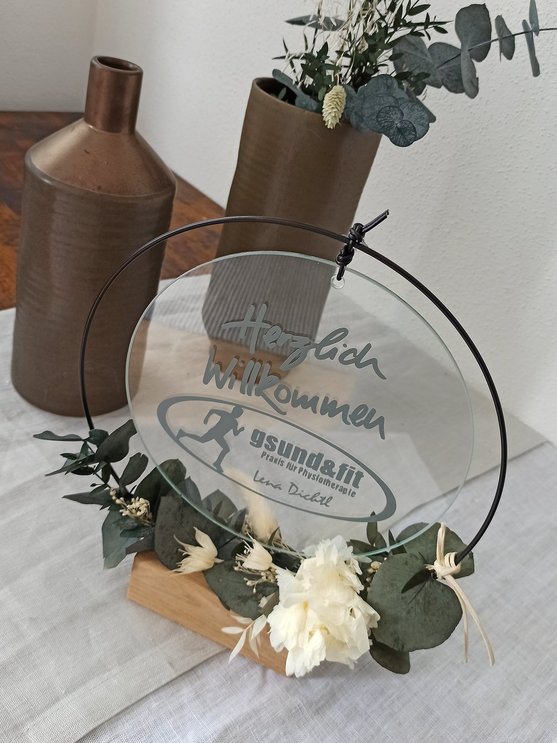 Liebevoll, individuell gestaltete Glasscheibe mit Deinem Wunschmotiv, alleinhängend oder auch zusammen in einem Metallring mit Trockenblumen ein Blickfang.
