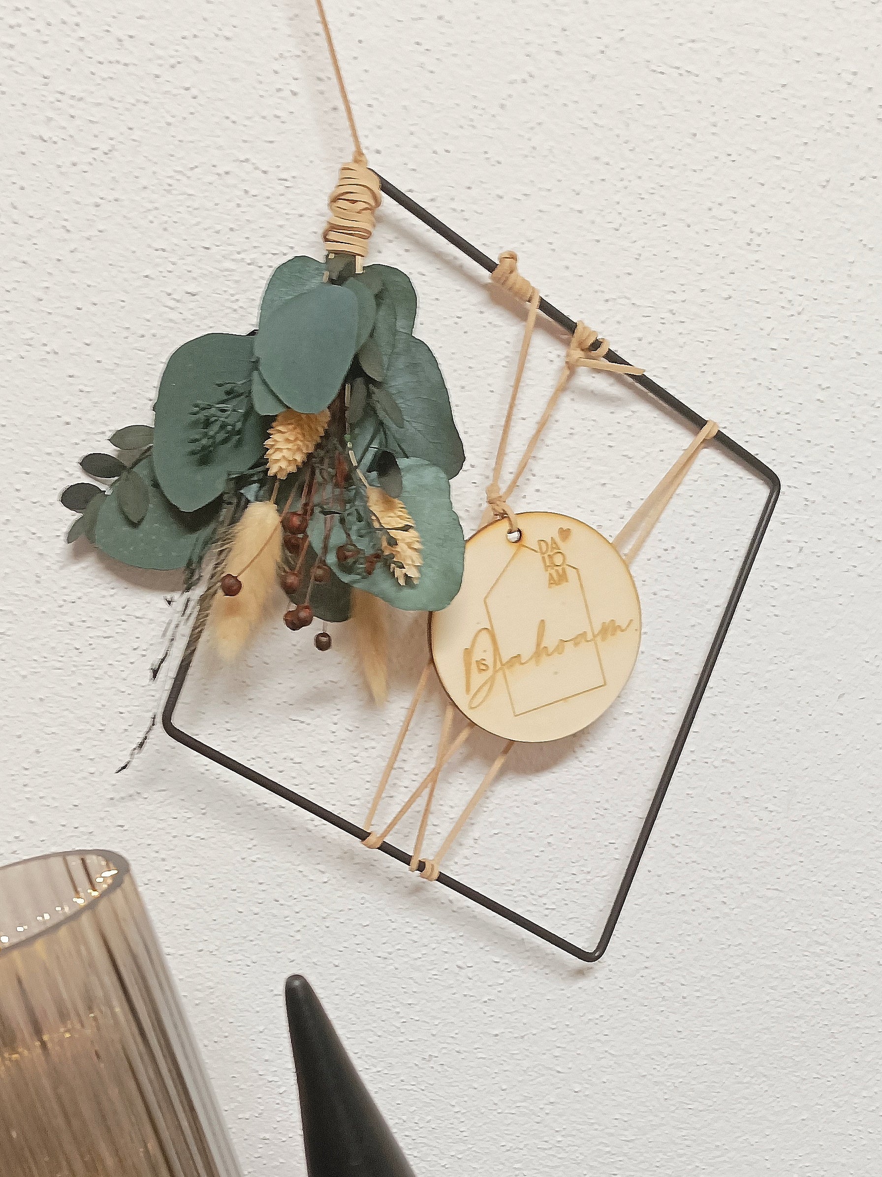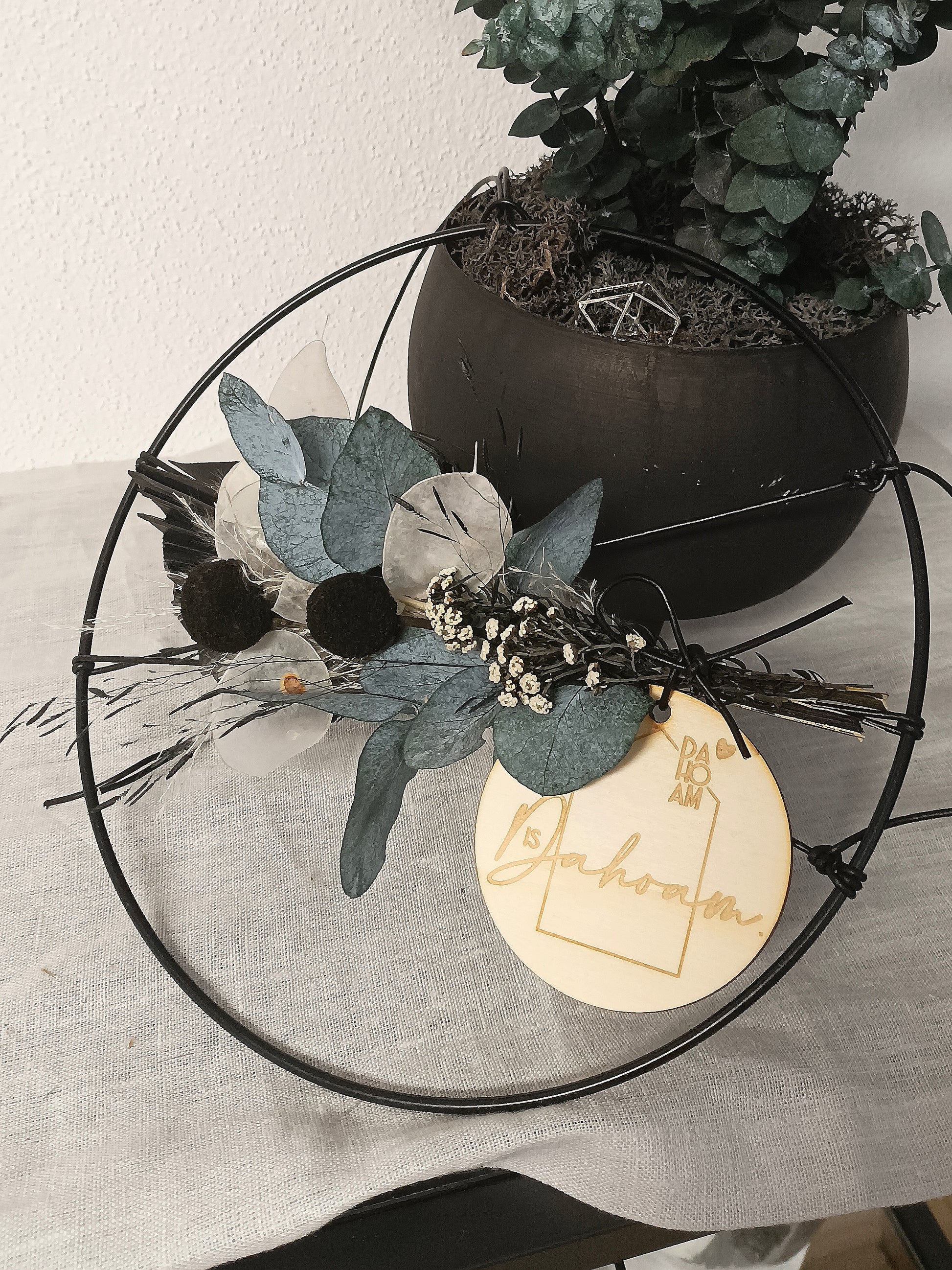 Liebevoll gestaltete Holz- oder Acrylscheibe passend für verschiedene Dekozwecke, alleinhängend oder auch zusammen in einem Metallring mit Trockenblumen ein Blickfang.