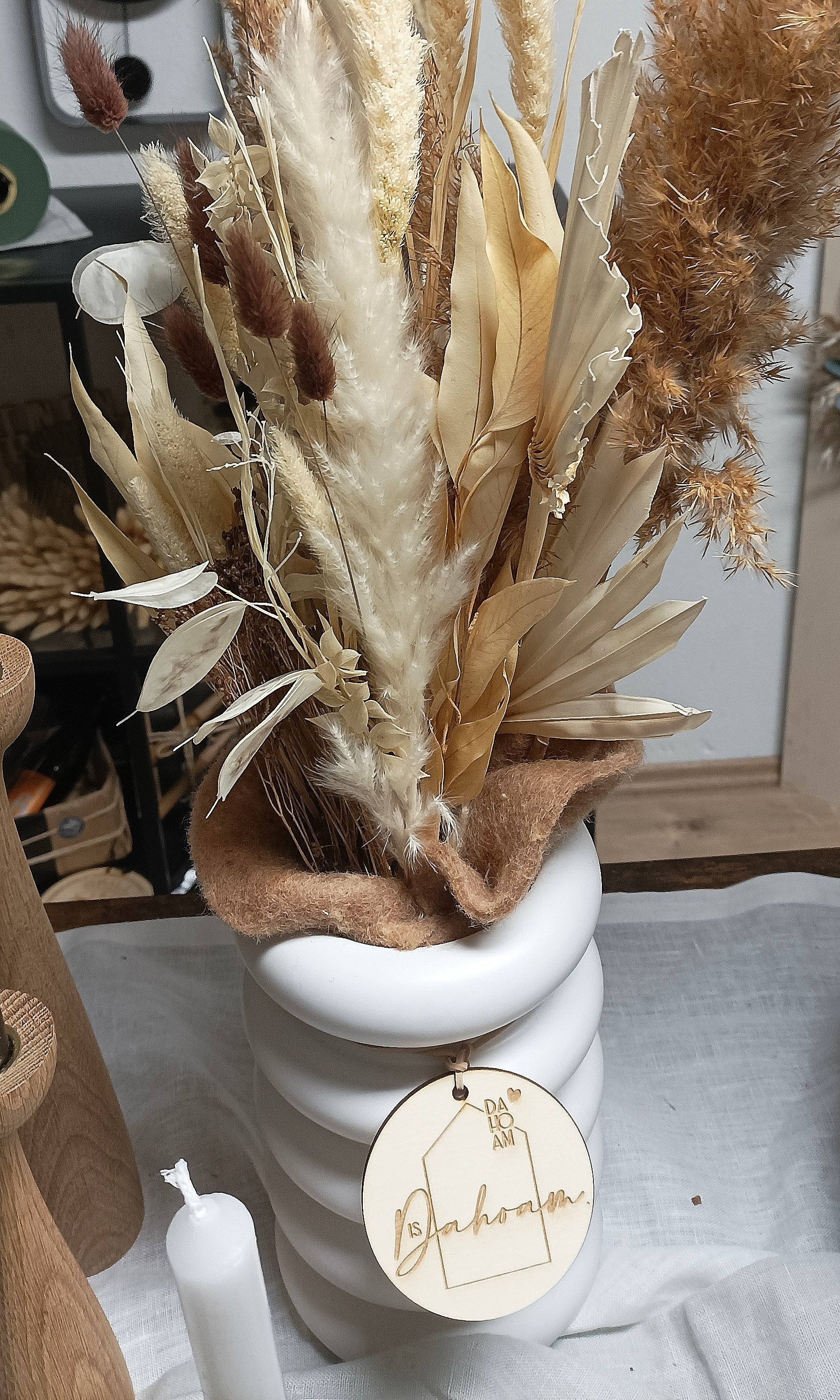 Die Trockenblumen können je nach Jahreszeit farblich variieren und auf Wunsch gerne an individuelle Vorlieben angepasst werden. Bitte um Absprache.
