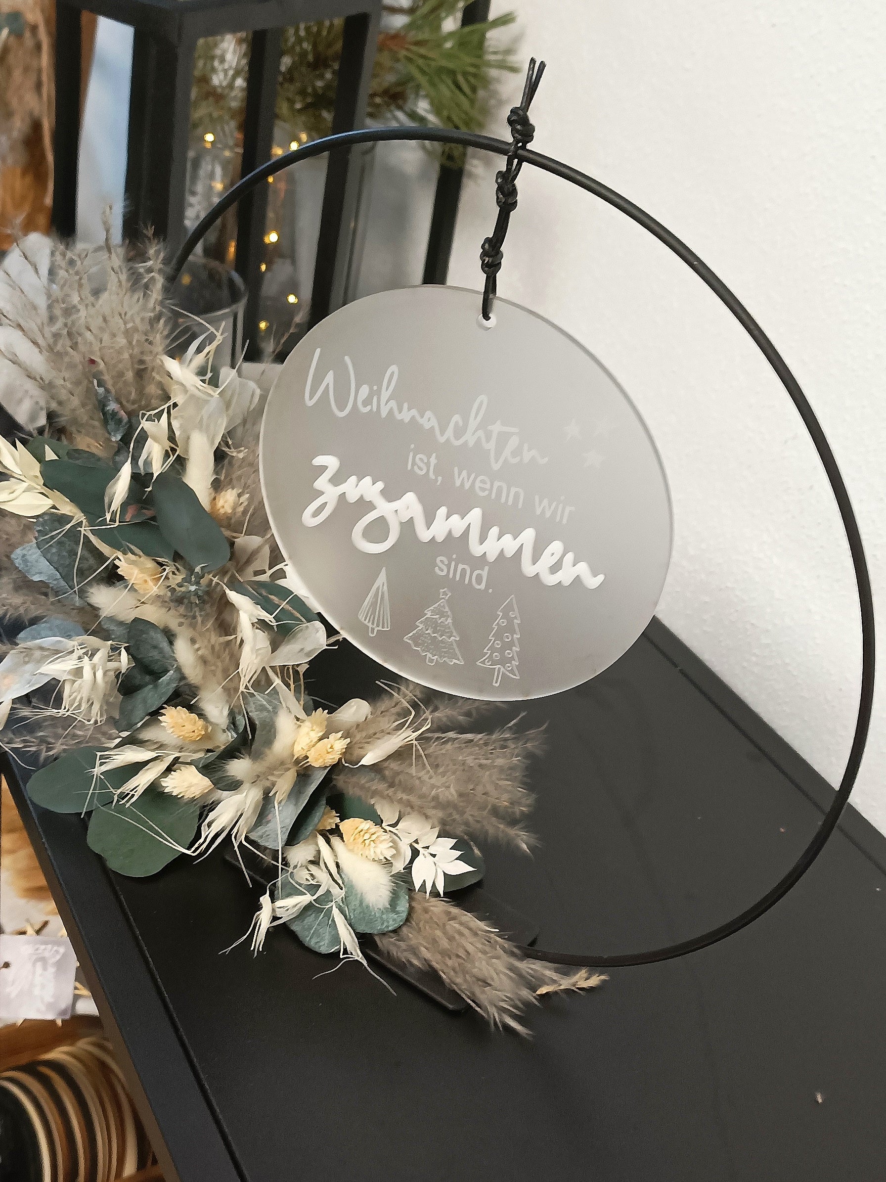 Liebevoll gestaltete Holz- oder Acrylscheibe passend für verschiedene Dekozwecke zur kalten Jahreszeit, alleinhängend oder auch zusammen in einem Metallring mit Trockenblumen ein Blickfang.
