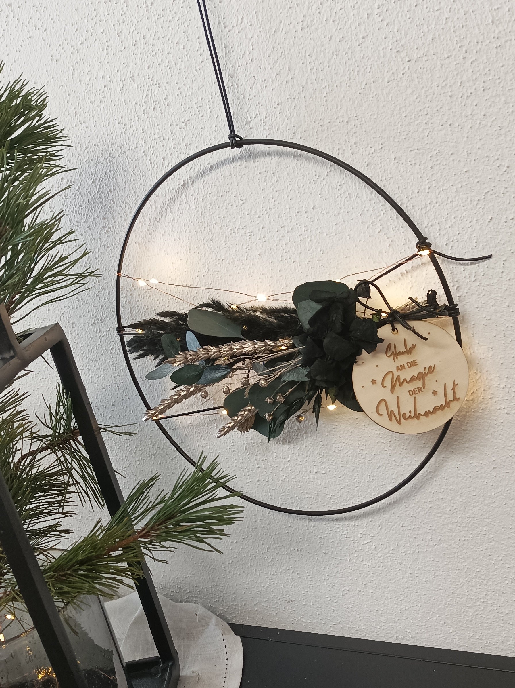 Liebevoll gestaltete Holz- oder Acrylscheibe passend für verschiedene Dekozwecke zur kalten Jahreszeit, alleinhängend oder auch zusammen in einem Metallring mit Trockenblumen ein Blickfang.