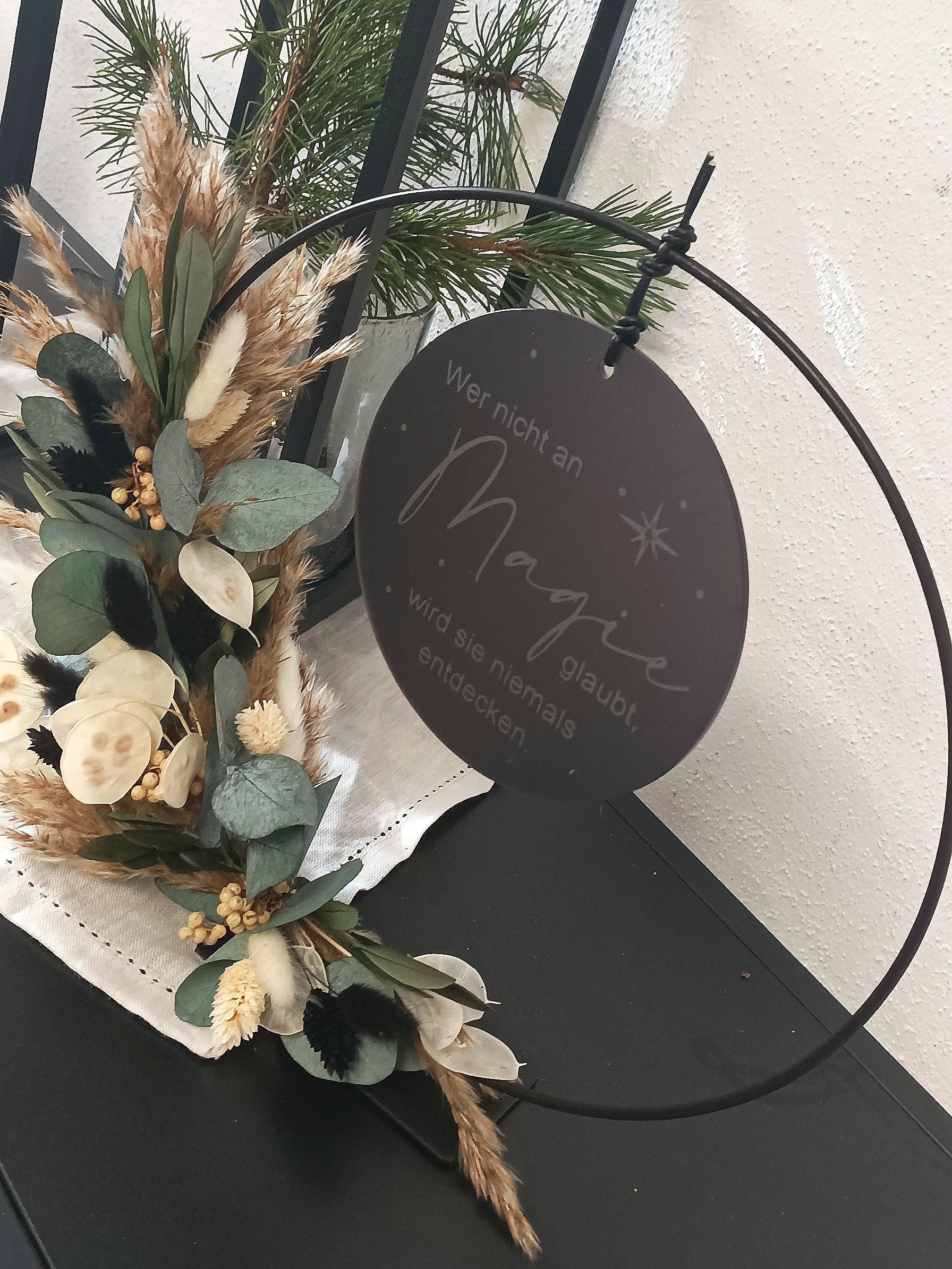 Liebevoll gestaltete Holz- oder Acrylscheibe passend für verschiedene Dekozwecke zur kalten Jahreszeit, alleinhängend oder auch zusammen in einem Metallring mit Trockenblumen ein Blickfang.