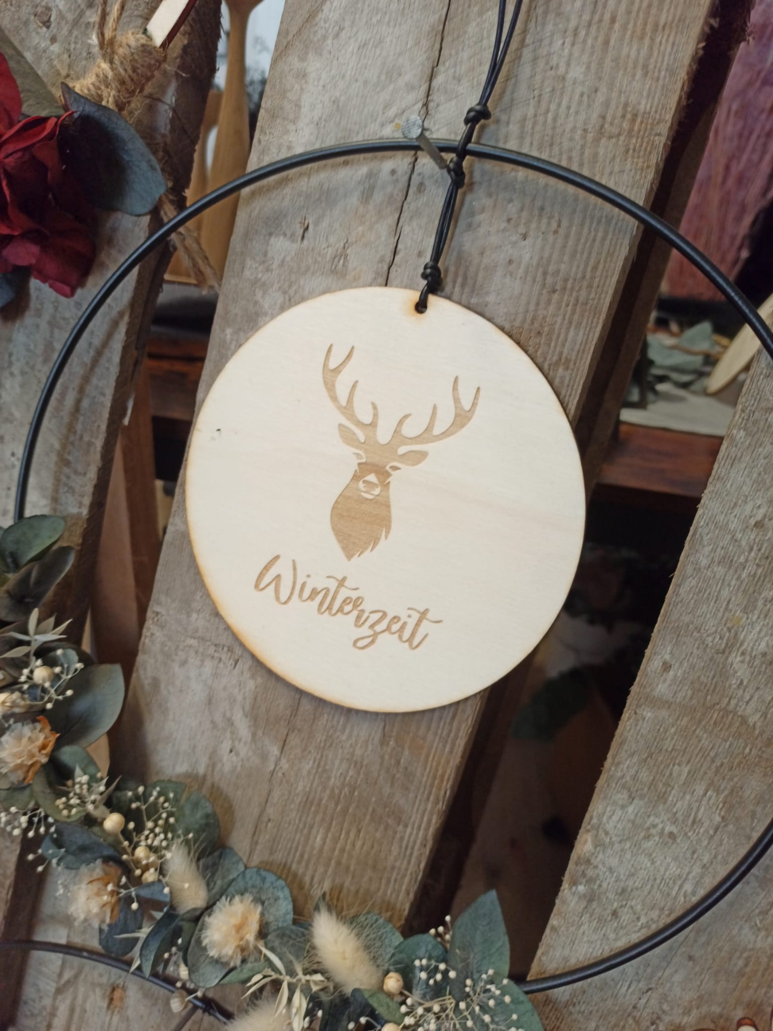 Liebevoll gestaltete Holz- oder Acrylscheibe passend für verschiedene Dekozwecke zur kalten Jahreszeit, alleinhängend oder auch zusammen in einem Metallring mit Trockenblumen ein Blickfang.