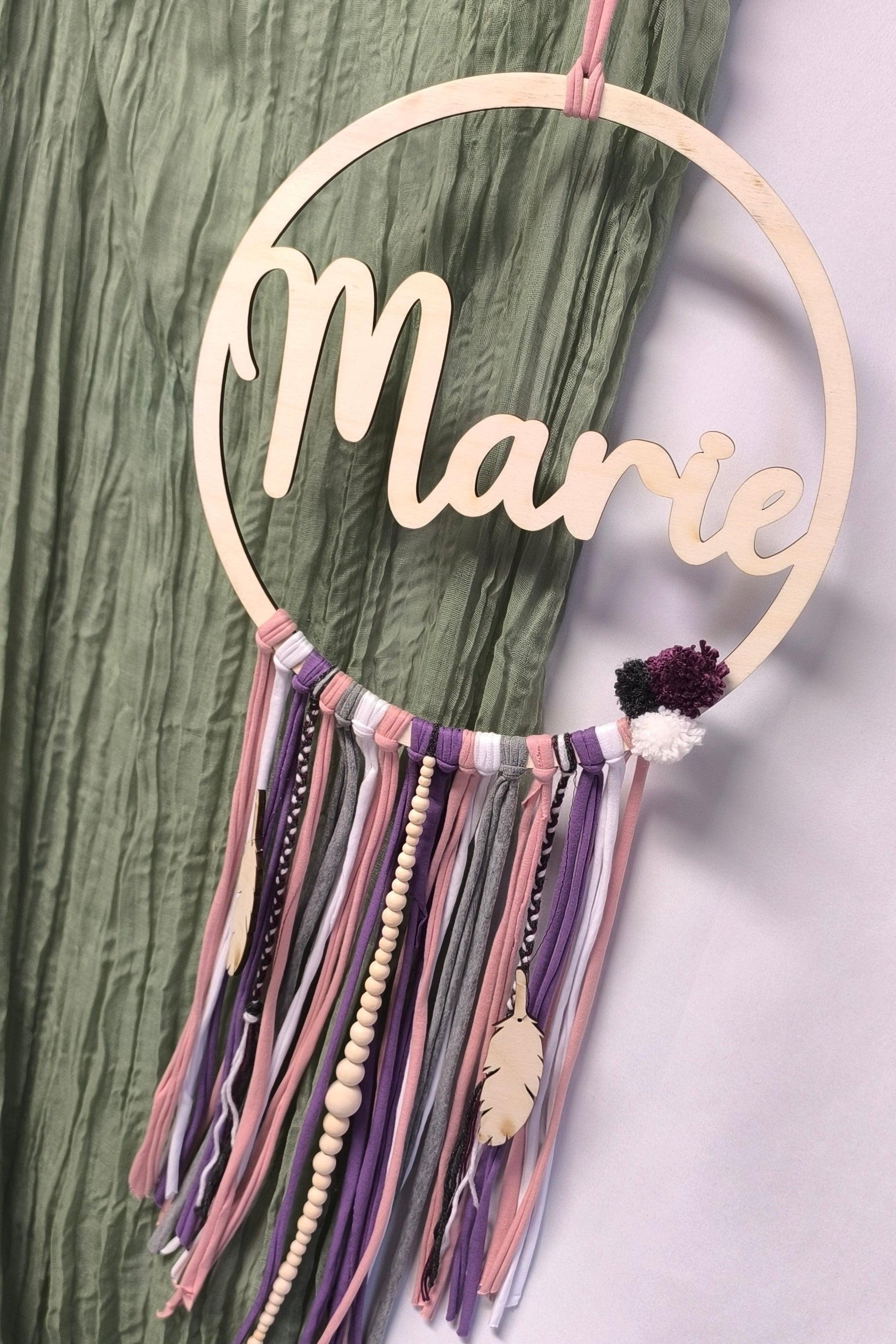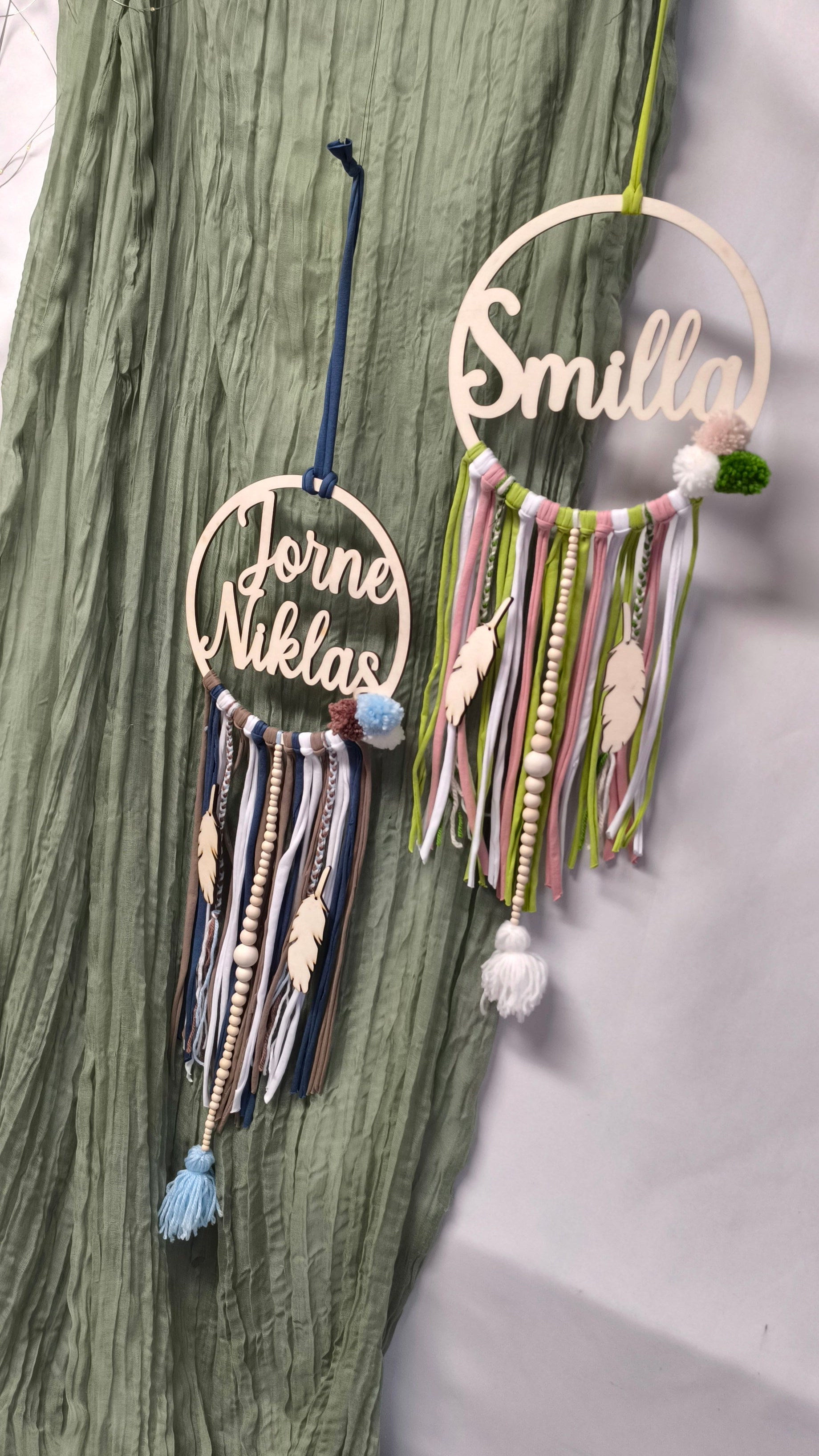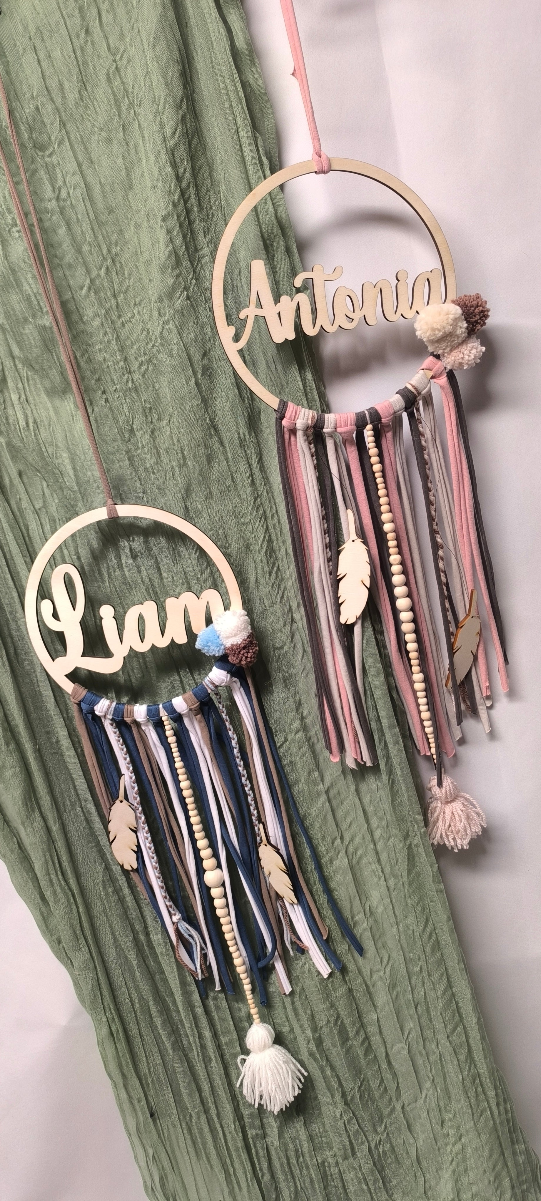 Handgefertigte Traumfänger als Blickfang für das Kinderzimmer mit individuellem Namen und Holzanhänger (standardmäßig mit Federn - andere Motive auf Anfrage)