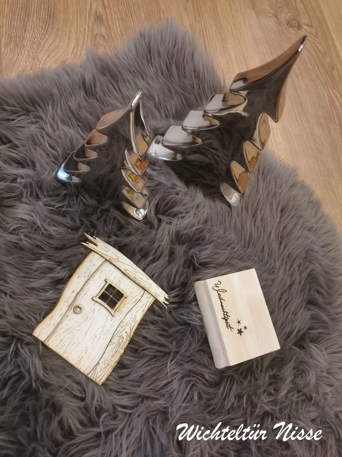 Wichteltür mit Holztruhe, Wegweiser, Christbaum und Fußmatte um in der staaden Zeit ein kleines bisschen Zauber nach Hause zu bringen.